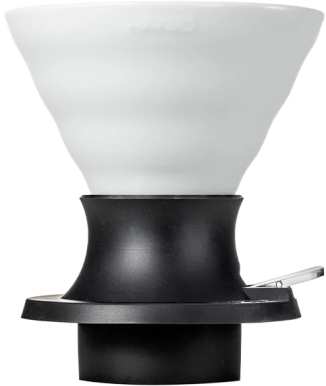 Die Hario V60-Immersionsbasis ermöglicht es, den Kaffee zunächst so lange wie gewünscht im Filter ziehen zu lassen und ihn anschließend per Knopfdruck in die Tasse oder Kanne abzulassen. Das Ventil funktioniert über eine kleine Edelstahlkugel, die sich beim Befüllen automatisch verschließt und durch den Hebel gelöst wird – so fließt der Kaffee sauber nach unten durch.